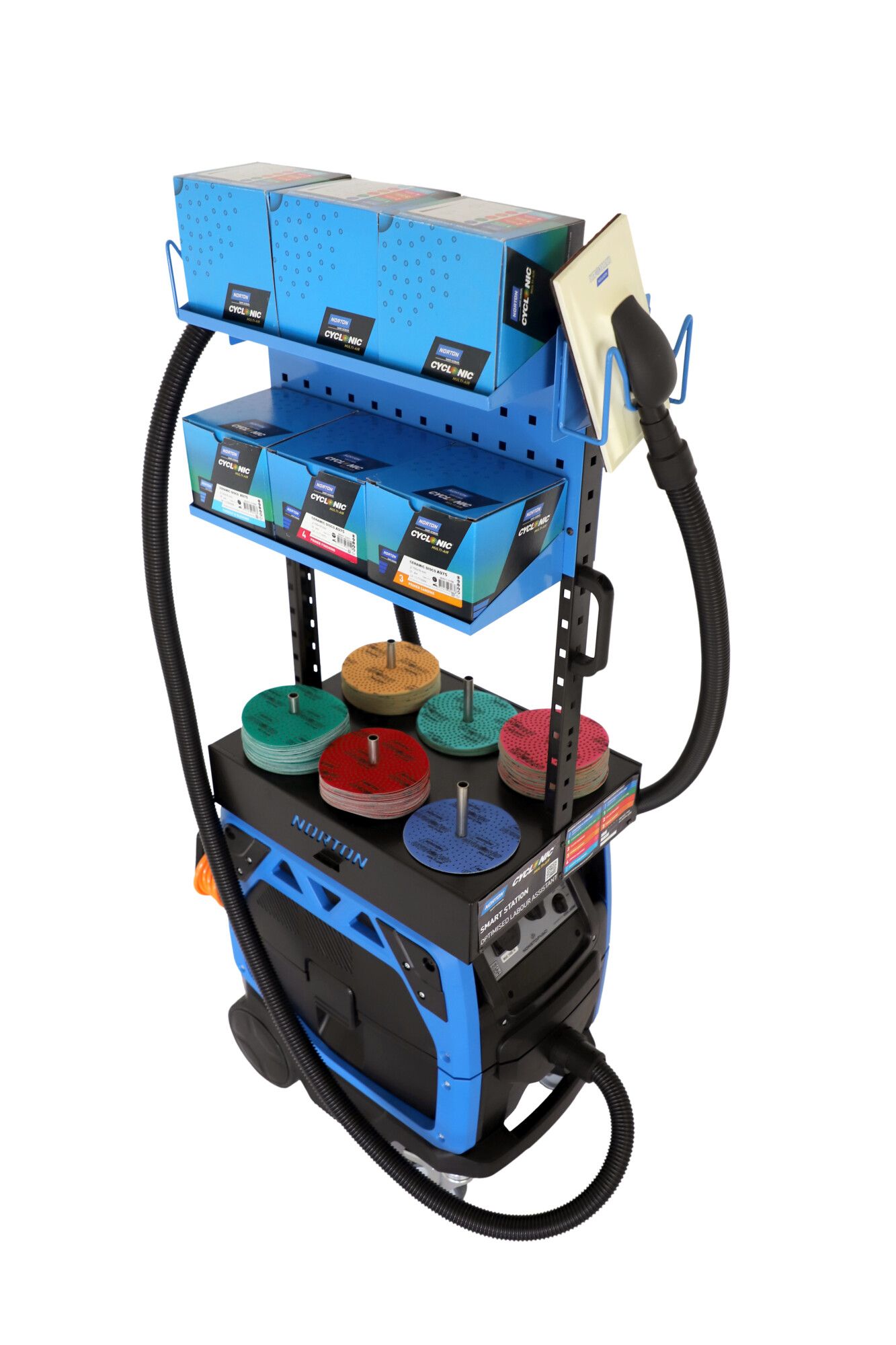 A Norton Smart Station munkaállomás egy kompakt csiszolórendszer, amely egy exkluzív Norton Cyclonic® adagolóval rendelkezik, amelyet egy sor polc és géptartó egészít ki. Rögzítse a Norton